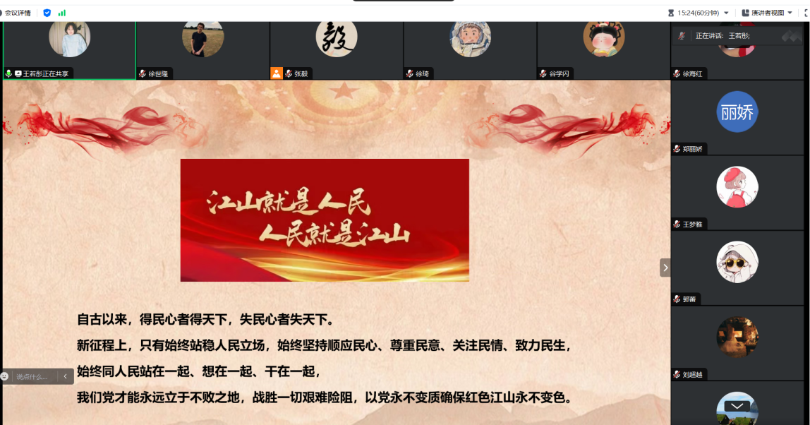 岁序常易催奋进,华章日新又一年。为深入学习贯彻党的二十大精神,推动习近平新时代中国特色社会主义思想主题教育深入开展,加强党员思想政治教育,坚定理想信念,yl23411永利集团研究生第三党支部于2024年2月25日下午在腾讯会议线上开展学习“人民就是江山”思想主题党日活动。
