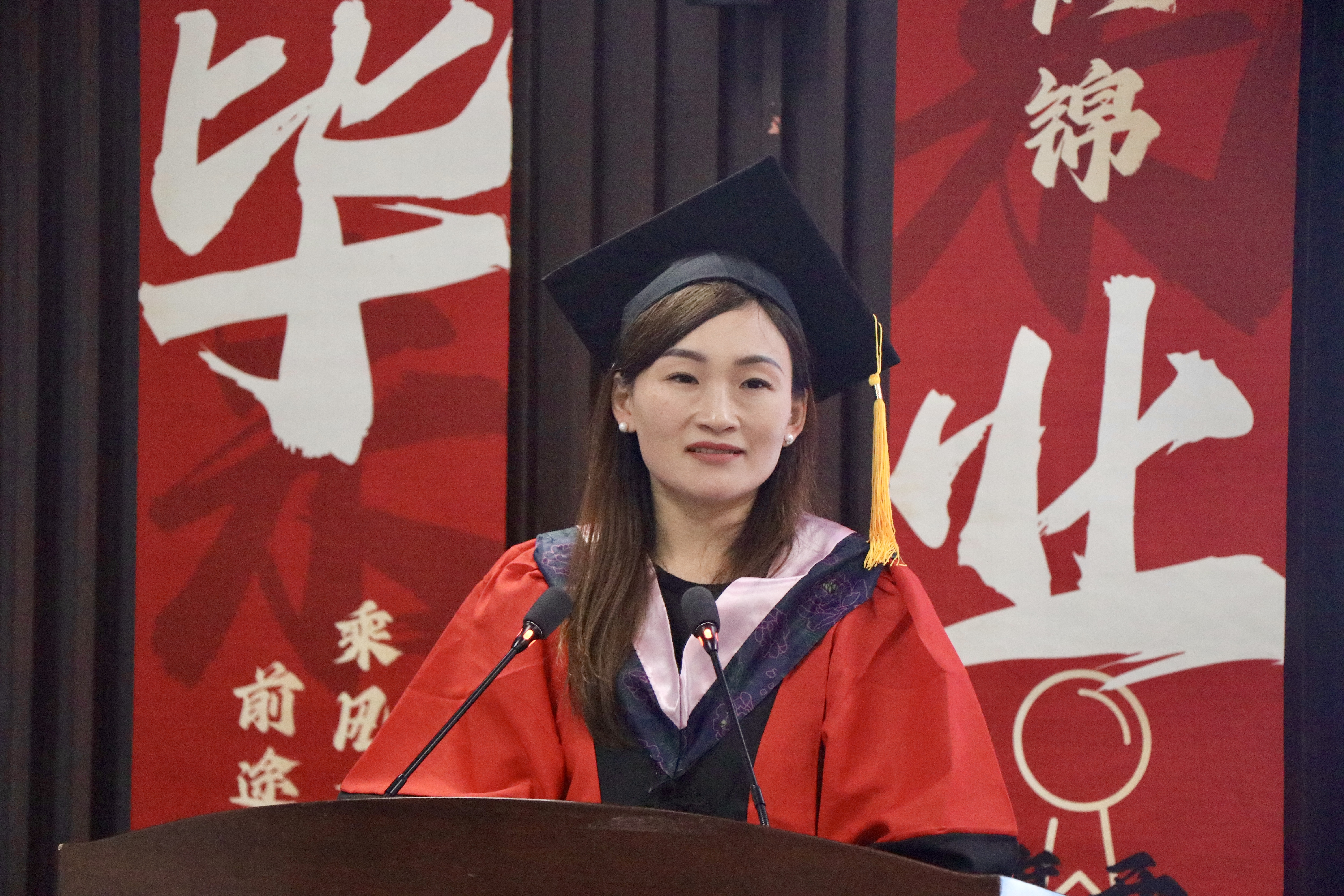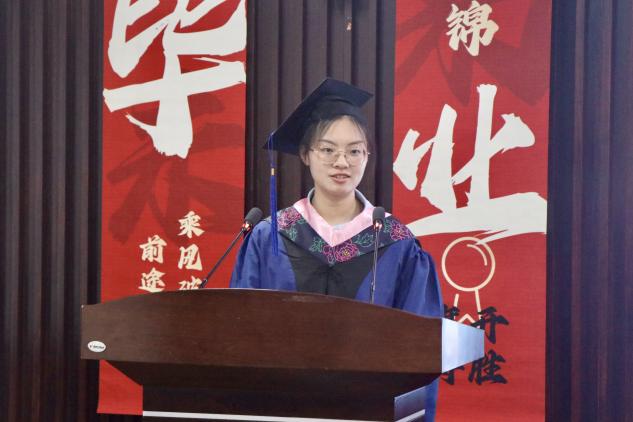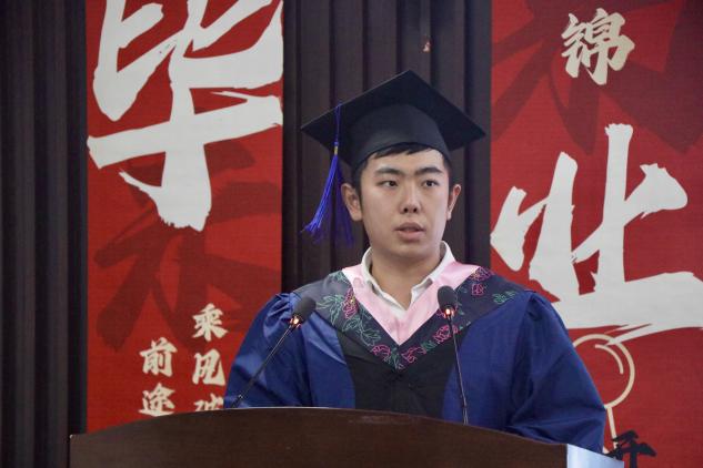 典礼上,上海市优秀毕业生代表黄涔岸、吕怡慧同学分别上台发言。黄涔岸分享了自己在母校的成长经历和感悟,表达了对母校、老师们以及同学们的祝福。吕怡慧感谢母校提供的优质学术资源和丰富实践机会,让她在学术道路上不断探索、不断进步。