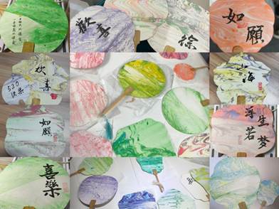郑文静老师首先介绍了非遗漆扇的历史渊源和文化背景,讲解了基本的制作工艺和操作手法。在制作环节,师生从选漆配色、下扇手法方面展开交流,一步步体验了漆扇的制作过程,将自己的创意和想法融入到了漆扇的创作中。一把把精美的漆扇在马院师生的手中诞生,扇面上色彩斑斓,或山水相映、或花团锦簇,再点缀上书法和印章,每一把漆扇都成为凝聚匠心与创意的孤品。一阵阵的赞叹和掌声也不断在活动现场响起,大家互相分享对漆扇作品的解读与欣赏。