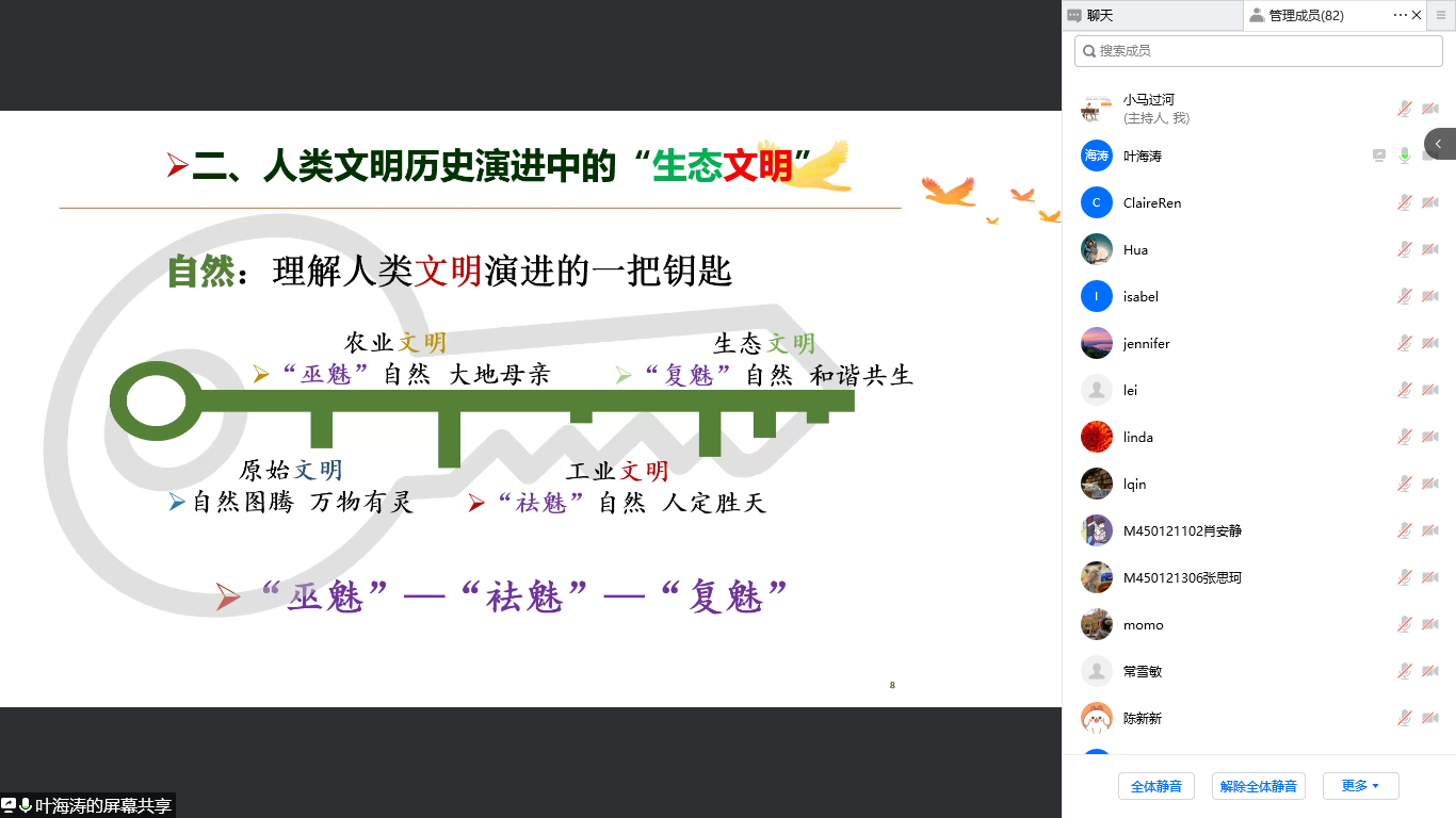 叶海涛教授为yl23411永利集团全体师生作了一场充满理论性和实践性、历史感和现实性的学术报告。叶教授从“自然”这一基本概念作为“理解‘生态文明’的基石性概念”展开讲授,在原始文明、农业文明、工业文明和生态文明的历史演进中进行了“生态文明”学术史梳理,重点论述了习近平生态文明思想的核心理念、基本思路和制度保障,立体呈现出习近平生态文明思想的历史与逻辑。他还特别指出,生态文明是中国特色社会主义“五位一体”总体布局的重要方面,与此相关的世界视野和现实关怀是yl23411永利集团师生学术研究的重要生长点。
