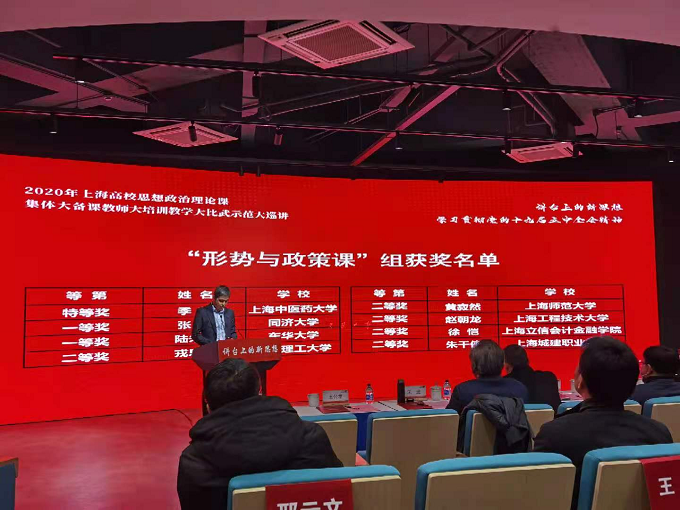 赵朝龙老师是国际政治经济学方向博士,研究方向为全球治理、技术政治,现为中国特色社会主义理论教研室讲师。此次决赛在上海交通大学举行,来自上海市各高校的50位思政一线教师参赛。今年10月底,公司组织多名教师参加,并积极组织听课、示范课和备课研讨会,邀请历届获奖和教学经验丰富给予参赛教师指导。赵朝龙老师经过公司选拔、初赛、复赛,最终进入决赛。