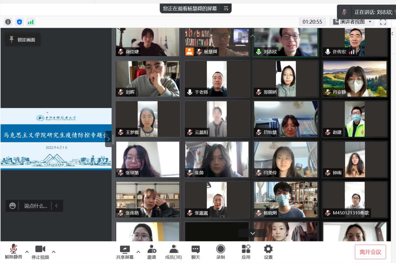 在疫情防控专题会上,经理刘志欣对马院全体研究生在疫情防控期间积极配合疫情防控工作、参与公司形势与政策课的录制、积极开展科研工作等工作给予了充分的肯定。同时对马院研究生提出四点要求:一要科学管理身体和调节情绪,确保身心健康;二是统筹线上课程学习和学术研究,提升理论研究能力;三是在做好个人防护的前提下,积极参加志愿者服务活动,在实践中锻炼自我;四是严守网络舆情纪律,做到不信谣、不传谣,守住底线,做新时代正能量青年。