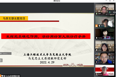 2022年4月29日,为更好总结课程教学经验,做好信息技术条件下思政课程质量建设,马院马原理教师党支部开展“用好新媒体技术,提升思政课时效性”主题党日活动,支部全体党员教师以及教研室非党员教师参加,支部书记闫虹珏副教授主持学习。