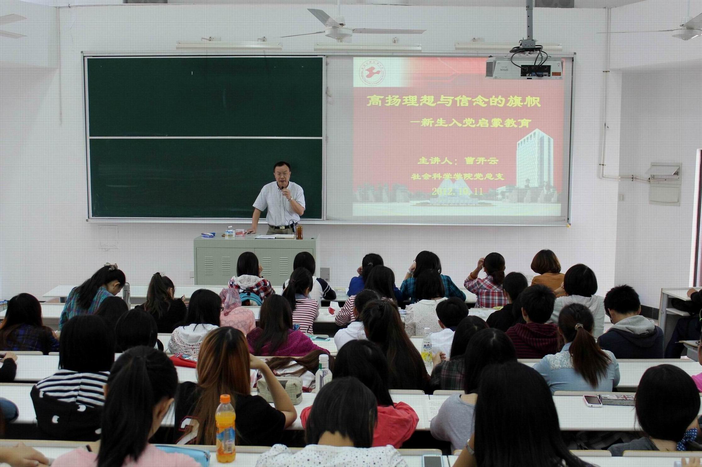 为了进一步让大一新生了解中国共产党,积极向党组织靠拢、加入党组织, 10月11日上午,社会科学公司党总支在教学楼J303为全院新生举行入党启蒙教育,社会科学公司党总支书记曹开云老师做了“高扬理想与信念的旗帜”的主题报告,公司党总支副书记范君晖老师,员工支部书记张强老师、副书记周淑芬老师共同出席了本次教育大会。