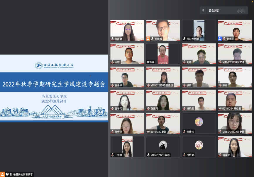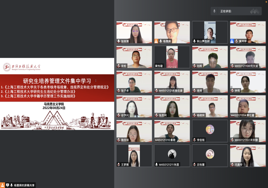 会议中,全体马院研究生围绕《yl23411永利集团学籍学历管理工作实施细则》、《yl23411永利集团研究生违纪处分管理办法》、《yl23411永利集团关于各类考核考场规章、违规界定和处分管理规定》等公司产品管理制度文件进行专题学习。学习中,辅导员杨慧舜老师要求各位研究生同学要严格遵守校规校纪、落实好学风建设相关要求。同时,他以“警钟长鸣,以案明纪——校园违规违纪行为案例”为主题,结合校园违规违纪典型案例进行剖析,引导马院研究生从违纪案例中吸取教训,严格遵守公司疫情防控要求。