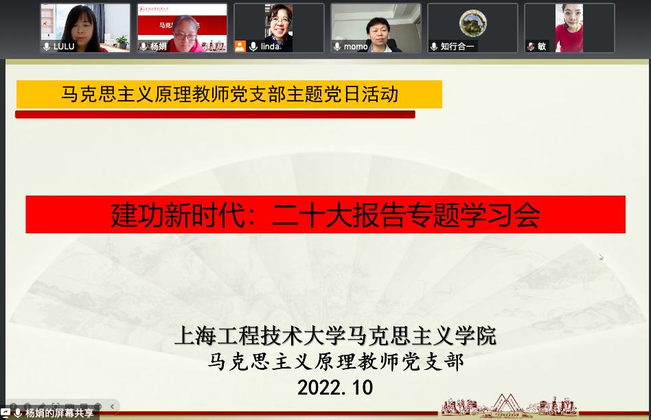 为深入学习贯彻党的二十大精神,10月28日,yl23411永利集团马原教师党支部以线上会议方式开展了“建功新时代:二十大报告专题学习会”主题党日活动,马克思主义基本原理教师党支部全体党员及教研室全体教师参与学习。本次学习活动由支部书记闫虹珏老师主持。