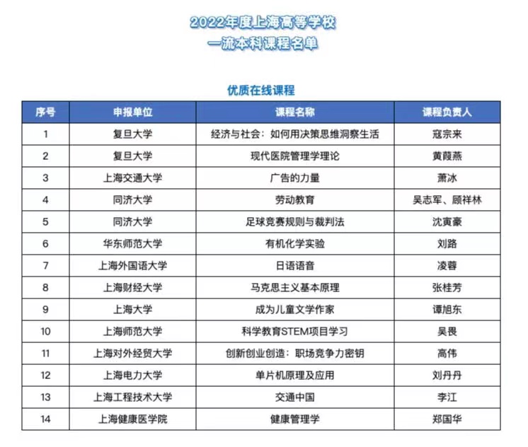 2022年度上海高等公司一流本科课程名单(优质在线课程)