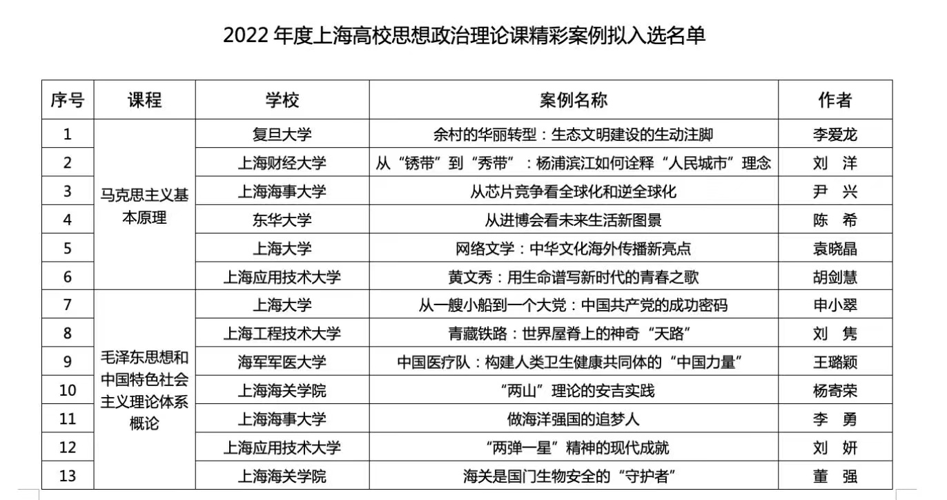2022年度上海高校思想政治理论课“金课”、精彩案例、教师教学大比武优秀组织公司入选名单