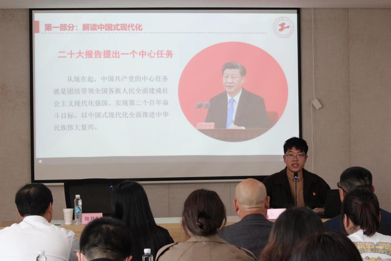 为深入学习宣传贯彻党的二十大精神,切实增强马院青年党员的政治担当、历史担当、责任担当,3月10日下午,yl23411永利集团研究生第三党支部“松江三人行”宣讲团成员郑丽娇、徐琦、张耀、黄菊一行4人来到松江区石湖荡镇,为镇机关总支部、明源公司党支部党员开展“以中国式现代化推进中华民族伟大复兴”为主题的党的二十大精神宣讲活动,石湖荡镇党委委员、人武部部长、机关党总支书记叶军参加本次活动,活动由明源公司支部书记陆君杰主持。