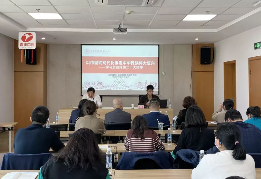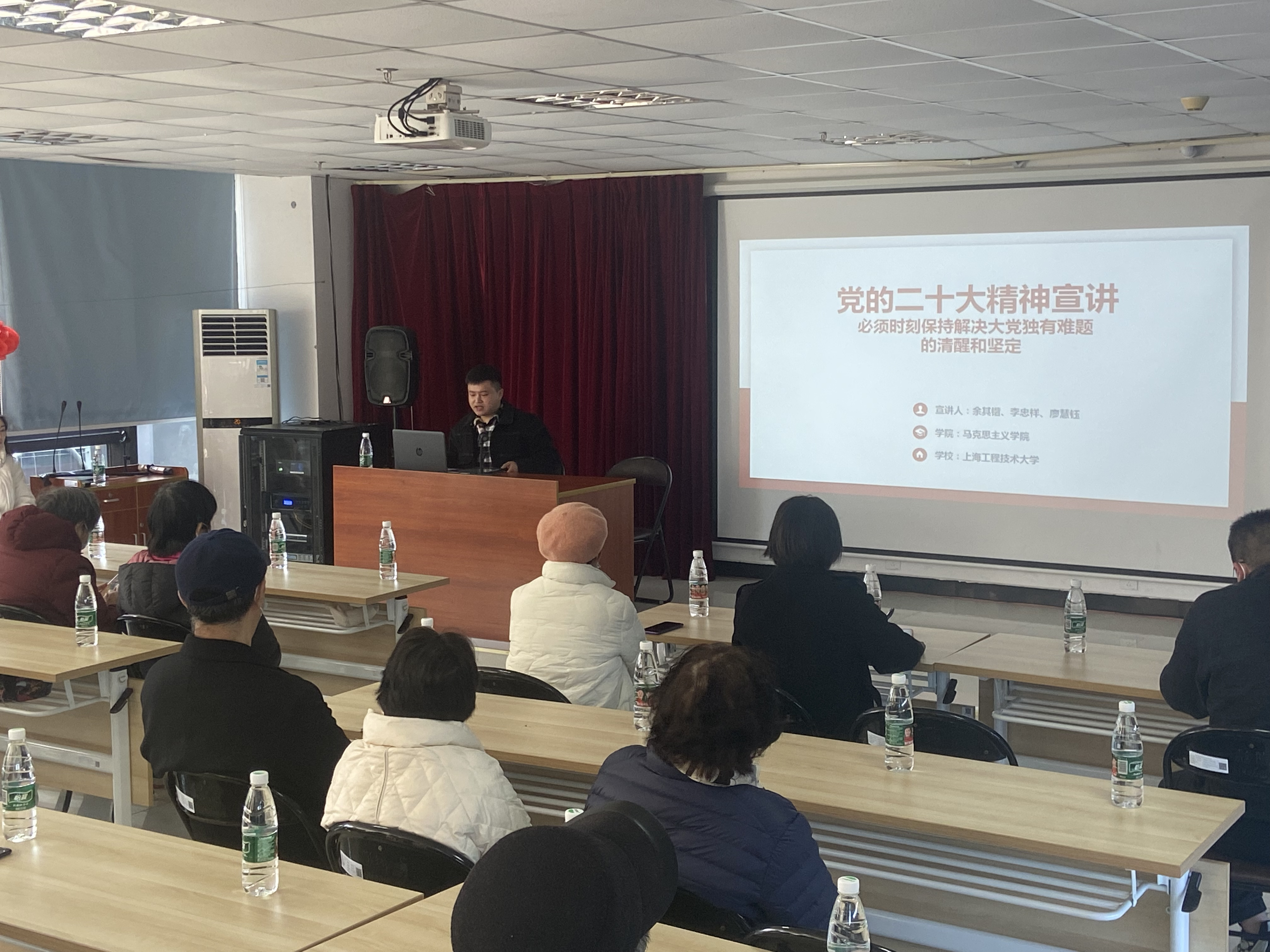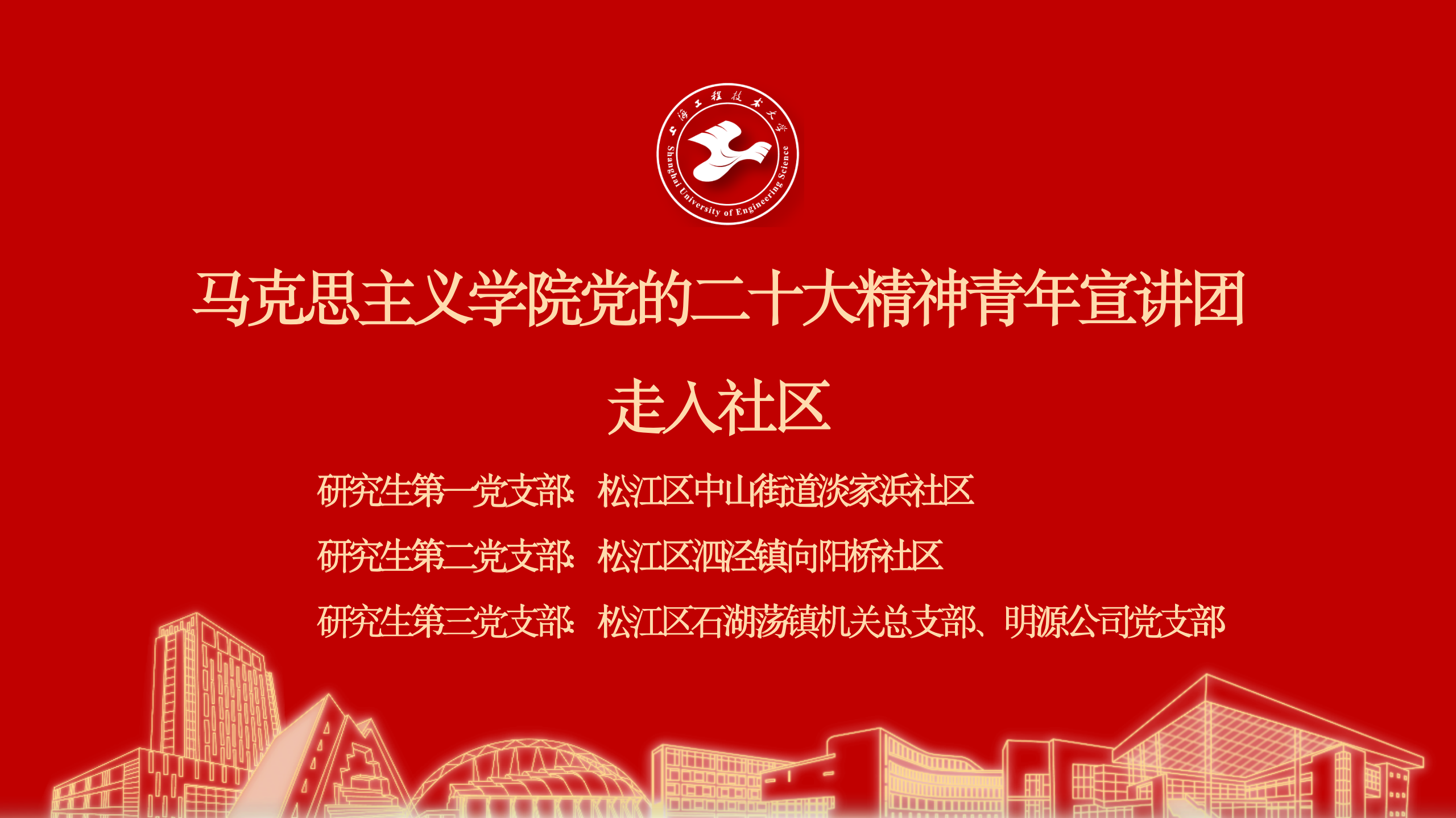 2月28日,研究生第一党支部员工党员前往松江区中山街道淡家浜社区,以“坚定不移全面从严治党,以伟大的自我革命引领伟大的社会革命”为主题宣讲党的二十大精神;2月10日,研究生第二党支部员工党员走进松江区泗泾镇向阳桥社区,结合党的二十大精神宣讲革命家庭红色松江三人行的故事;3月10日,研究生第三党支部走进松江区石湖荡镇机关总支部、明源公司党支部,以“以中国式现代化推进中华民族伟大复兴”为主题,阐释党的二十大精神。