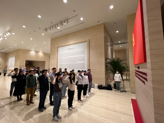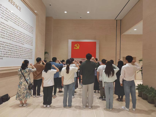 在中国共产党第一次全国代表大会纪念馆入党宣誓墙前,全体员工党员面向党旗,重温入党誓词。在铿锵有力的宣誓声中,每位党员重忆入党初心,豪迈的声音震撼着在场的每一位党员,彰显了对党忠诚、为共产主义事业奋斗终身的决心。