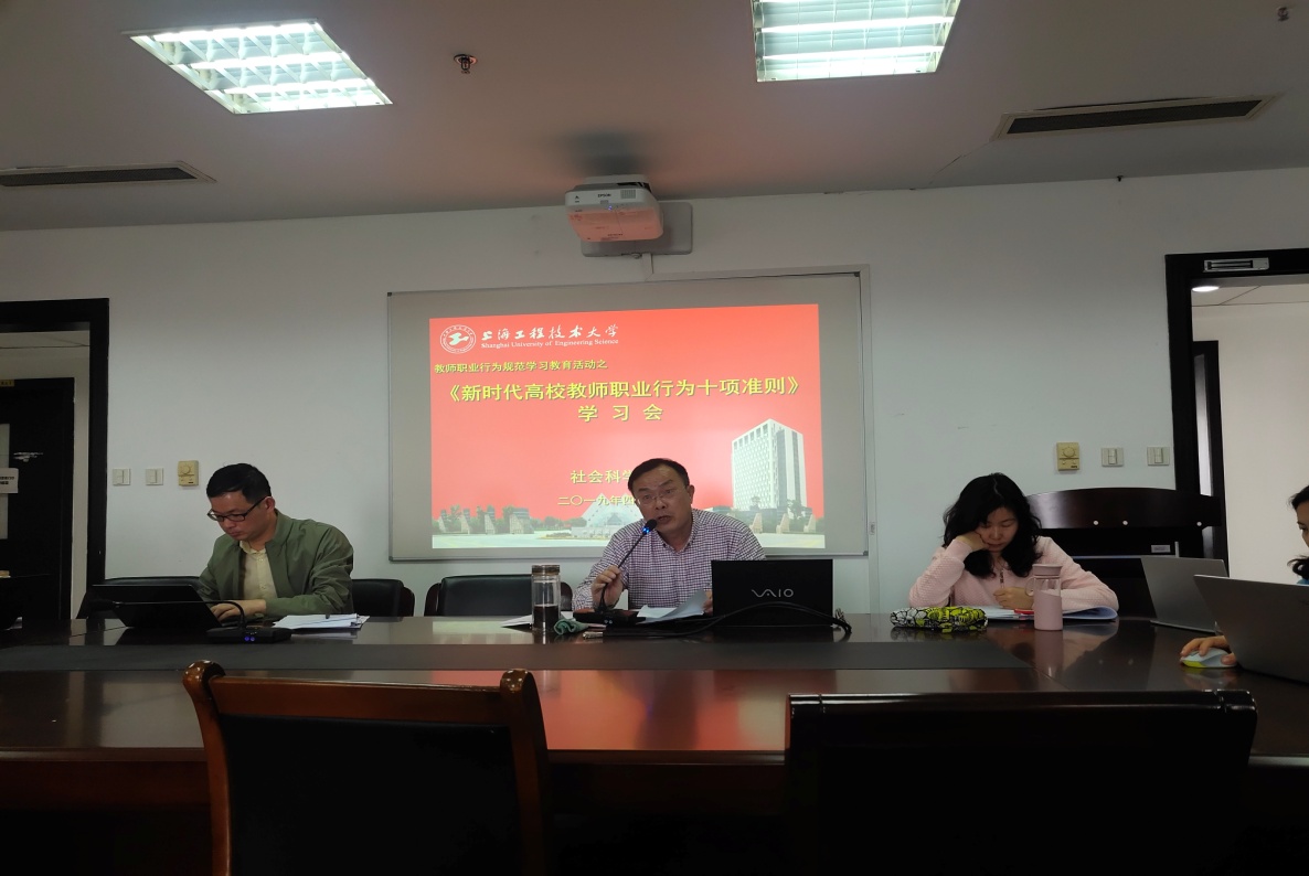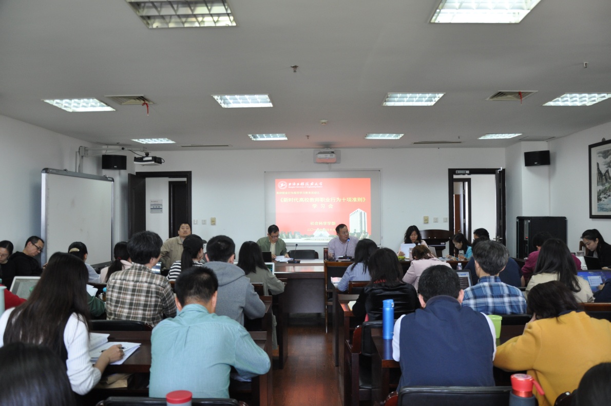 为深入贯彻落实全国高校思想政治工作会议、全国教育大会等有关精神,4月19日下午,公司党支部书记曹开云在行政楼812为社会科学学部全体教师作了《新时代高校教师职业行为十项准则》专题学习会。学部全体领导和教师参加了会议。